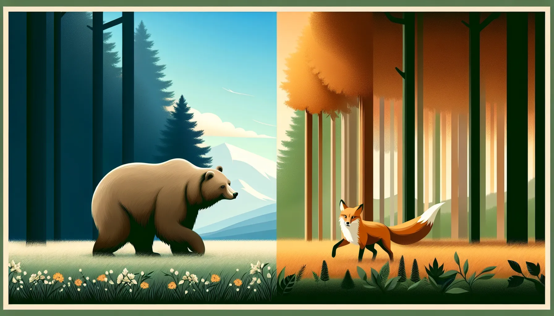 Priča “Medvjed i lisica” govori o nespretnom medvjedu i lukavoj lisici koja koristi svoju pamet kako bi prevarila medvjeda, pokazujući razliku između snage i mud