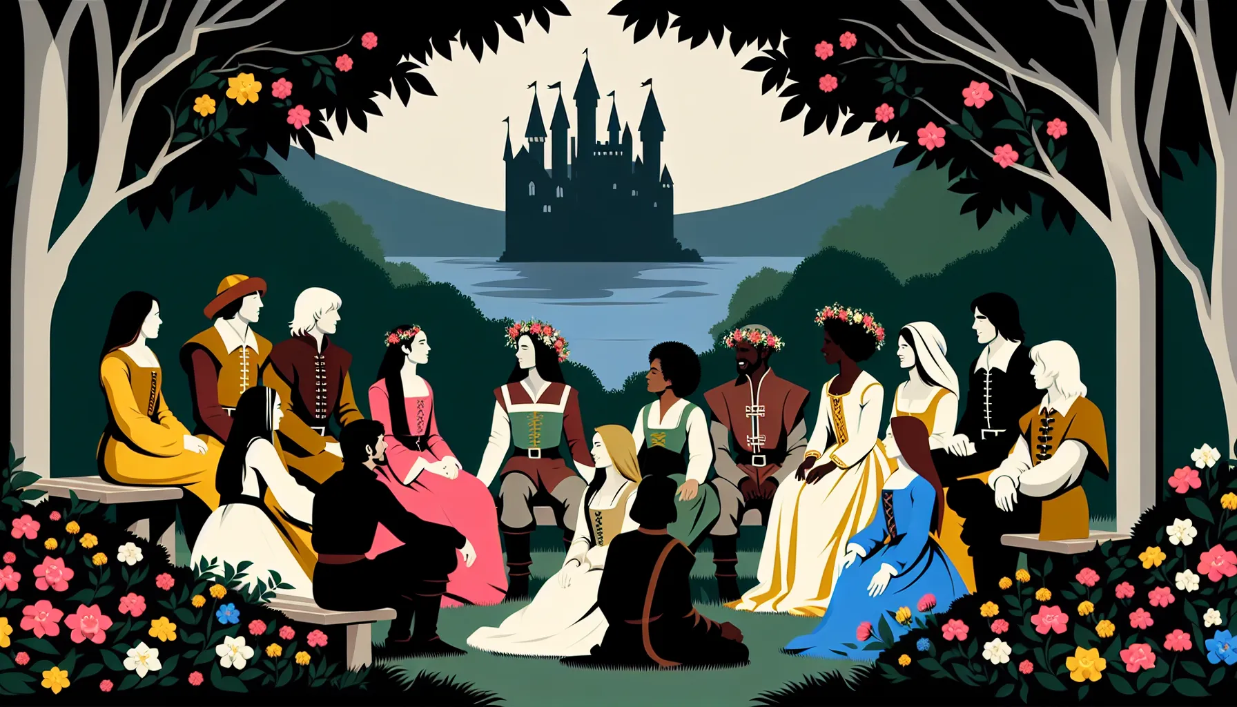 Pampinea baca početnu ideju – ajmo pobjeć od kuge. Queen energy. Onda Filomena – prava strateginja, ona voli držati društveni red i raspored. Fiammetta? Zvijezda svake zabave, malo sentimentalna, puno hrabra. Emilia je ona osoba koja ti uvijek donese kekse kad si tužan – uvijek empatična. Lauretta je jednostavno duša—ne pravi se važna, ali kad zatreba, svi ju slušaju.