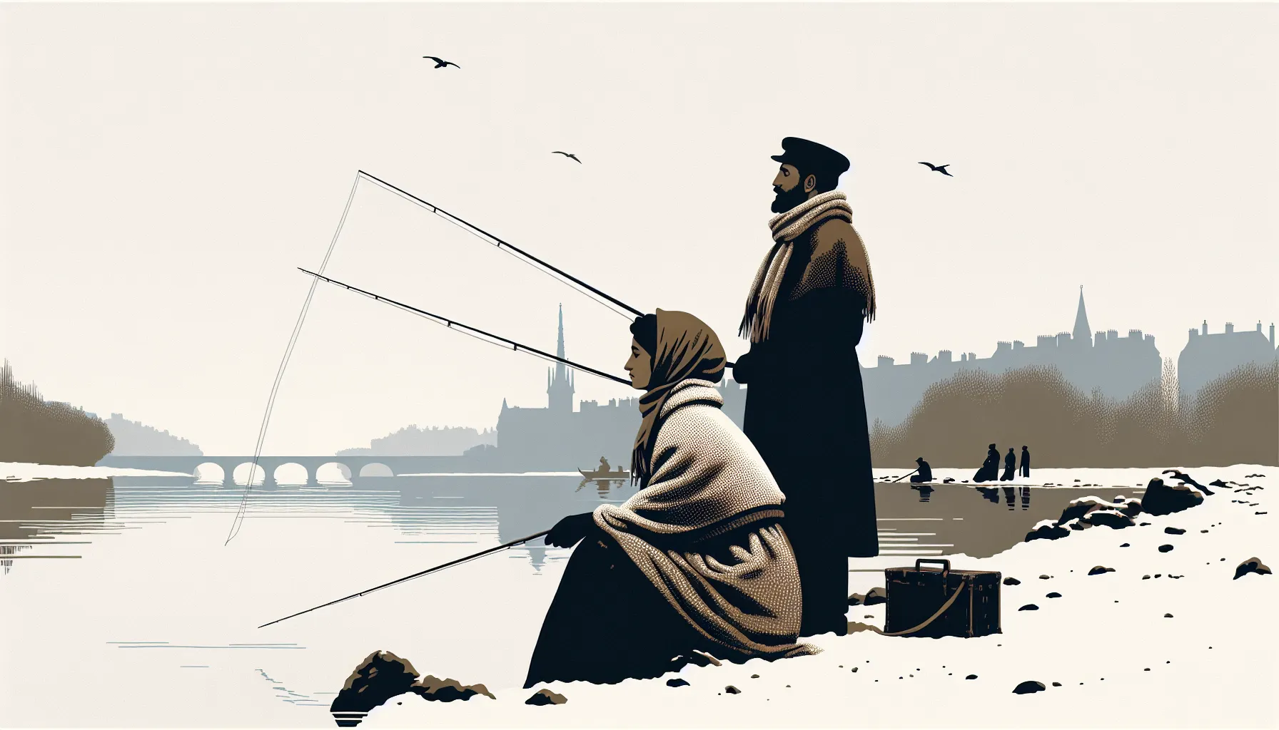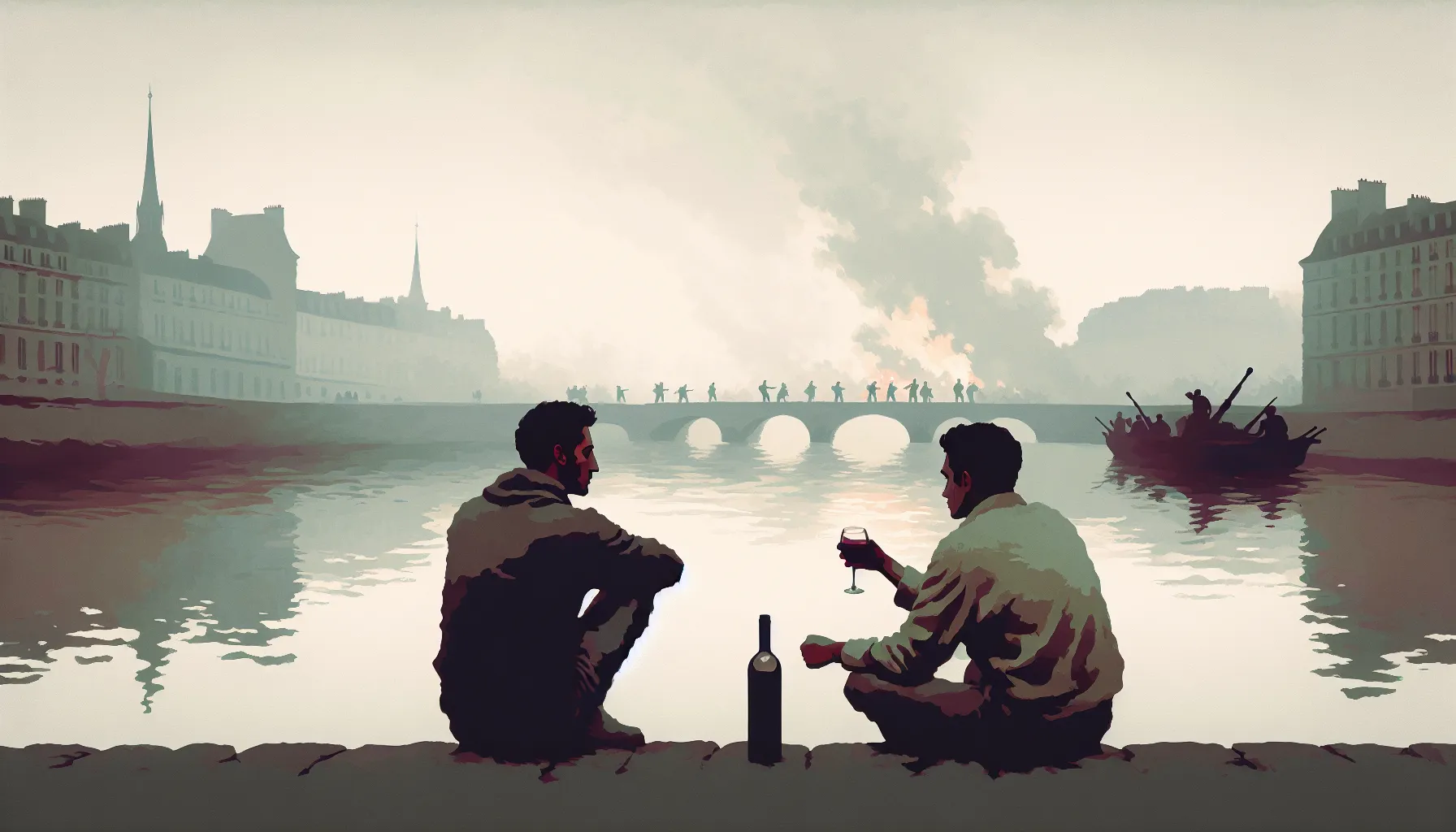 Vrijeme radnje smješta nas u siječanj 1871. — baš pred kraj francusko-pruskog rata. Zima je ledena, nebo puno sivila, rijeka hladna, a grad pod opsadom djeluje urušeno… kao da malo toga može podgrijati nadu. Sve što se događa – od tišine na vodi do škripanja vojničkih čizama u daljini – podsjeća da su granice „normalnog“ života naprasno iščeznule.