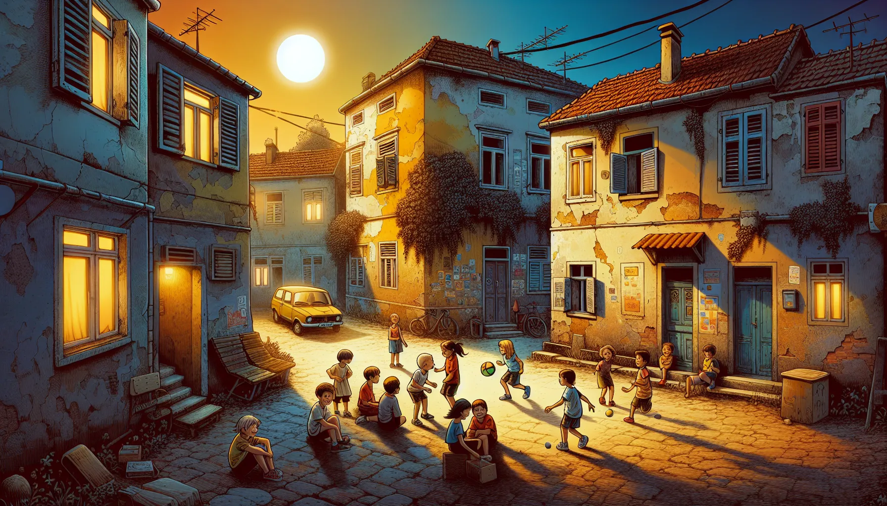 Što se tiče „Mraka na svijetlim stazama“, radnja ne kreće bajkovito; sve se odvija u jednom malom, prilično običnom mjestu. Zamislite kvart iz djetinjstva – asfalt koji pucketa pod nogama, zgrada koja se ljušti (ona stara žuta na uglu, znaš na koju mislim?) i one dućane u kojima prodavačica već zna da Ivan kupuje iste čokoladice svaki dan. Atmosfera djeluje poznato, gotovo opipljivo. U zraku se miješaju mirisi vlažnog lišća i svježih krafni iz obližnje pekare, dok se buka škole povremeno smiješa s tišinom napuštenih igrališta.