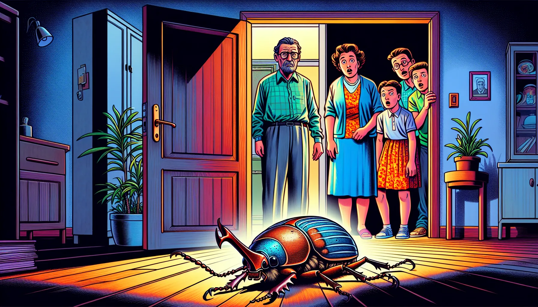 Šef ga već čeka na poslu, roditelji mu kucaju i viču. Svi pokušavaju ući u sobu, nitko ne zna što da misli. Ono što slijedi nije tipičan obiteljski doručak: sestra Grete najprije ga nježno pokušava razumjeti, ali otac – gospodin Samsa – baca pogled, pa jabuku. Ono što je jednom bila rutina sada je cirkus.