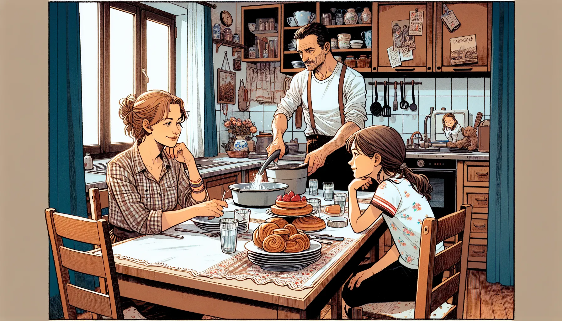 Odnos između oca i majke podsjeća na dva suputnika koji znaju svaku pukotinu na staroj stazi, ali se ipak ponekad spotaknu. Često se prepoznaje tiha solidarnost, ponekad i ranjivost — kao kad on pogleda nju s one strane stola, a ona odvrati pogled van kroz prozor. Ne treba uvijek puno riječi; puno toga vise u zraku.
