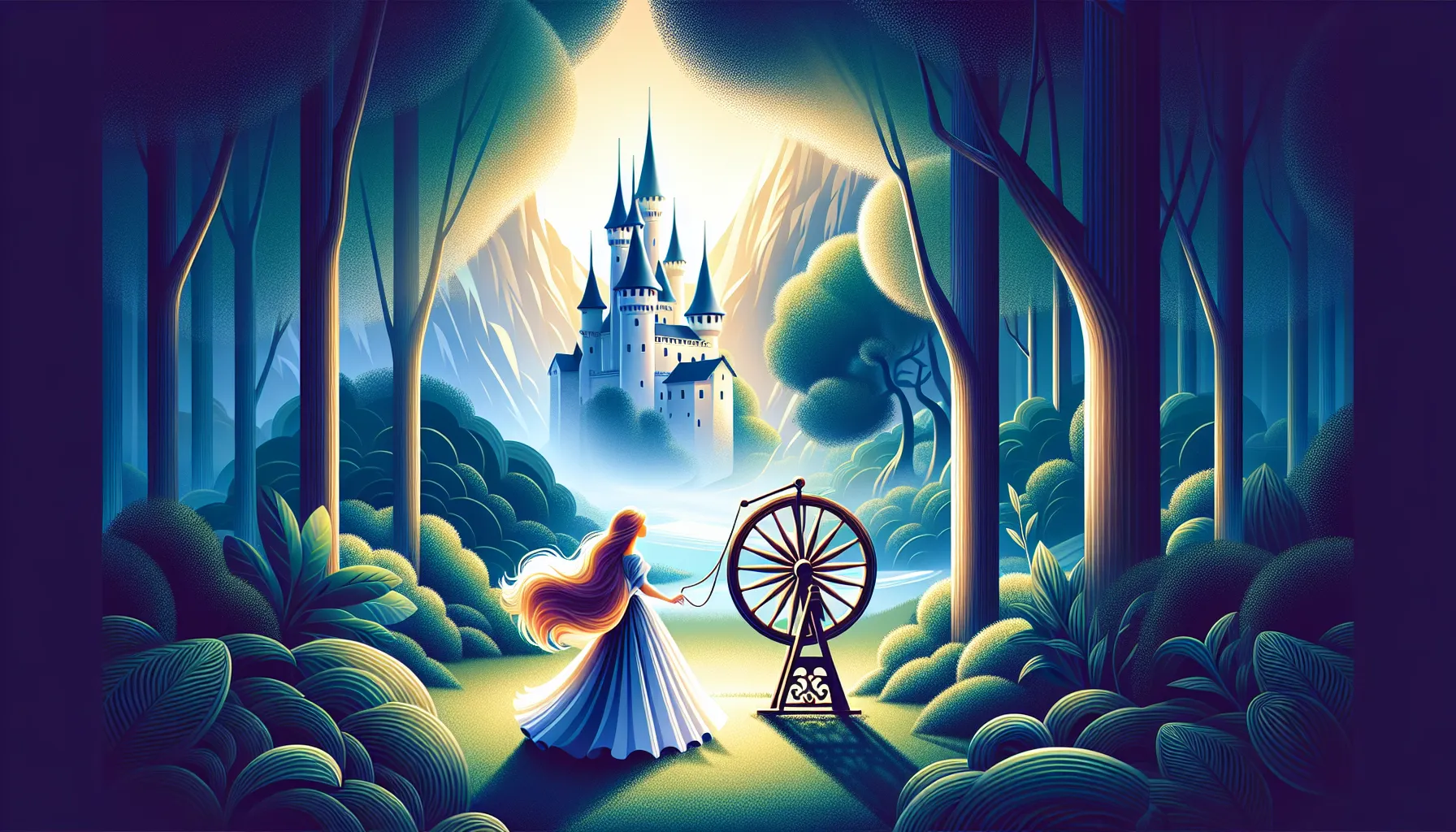 Na svoj šesnaesti rođendan, ona k’o iz vedra neba, nabasa na skriveni toranj. U tom trenu, starica koju nitko nikad prije nije vidio (nije teško pogoditi o kome je riječ) daje joj ono čuveno vreteno. I — tren kasnije — čitav dvor tone u san. Kućanstvo postaje tiši od nedjeljnog popodneva kad svi spavaju na selu.