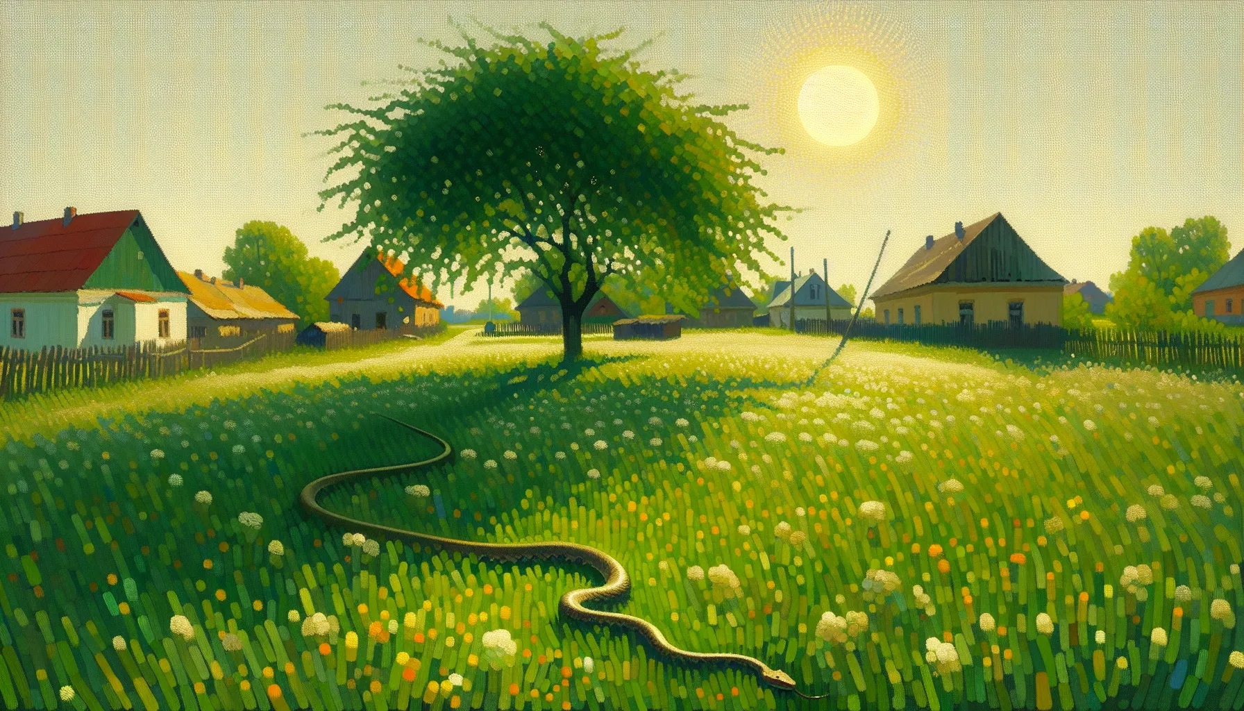 Možda biste pomislili da je tu još netko – neka baka na prozoru ili ptičica na grani. Ali sve drugo je drugorazredno. Čak i priroda, iako slikovito opisana, ovdje igra treću violinu. Svi drugi „likovi“ — od trave do povjetarca — služe kako bi naglasili usamljenost i napetost susreta sa zmijom.
