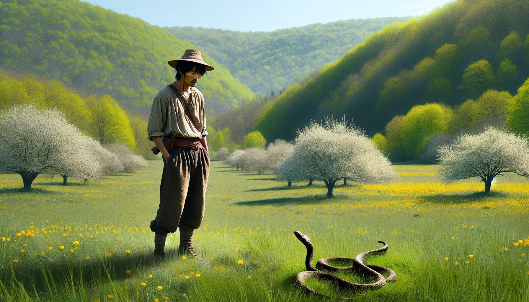 U središtu svega — lik naratora ili lirskog subjekta. Nema ovdje imena iz filmova, nema superjunaka s plaštem. Samo jedan čovjek. On šeta kroz proljetni krajolik, uživa u mirisu zemlje, i – gle čuda – odjednom mu put prepriječi zmija. Nije on neki avanturist, nego običan čovjek koji možda ljubi prirodu, možda bježi od gradske vreve, a vrlo vjerojatno samo traži malo svježeg zraka.